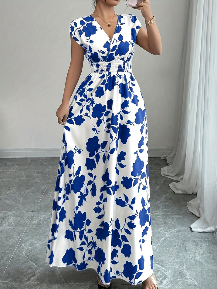 Grace meets comfort — this flowing pink floral maxi dress features a flattering V-neckline, short sleeves, and a cinched waist for an effortlessly feminine silhouette. Perfect for spring or fall, it transitions beautifully from casual outings to formal events.